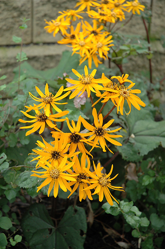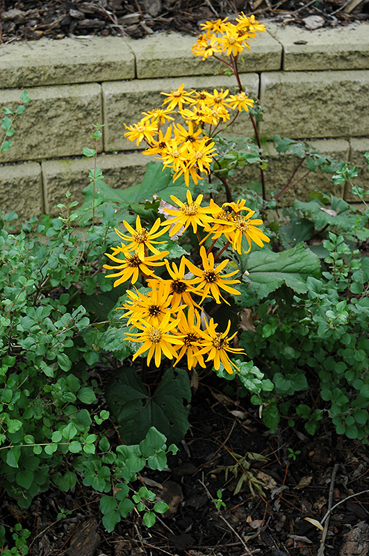 Desdemona Rayflower features bold panicles of gold daisy flowers at the ends of the stems from late summer to early fall. Its attractive large serrated round leaves emerge deep purple in spring, turning dark green in color with curious purple undersides and tinges of deep purple throughout the season.
