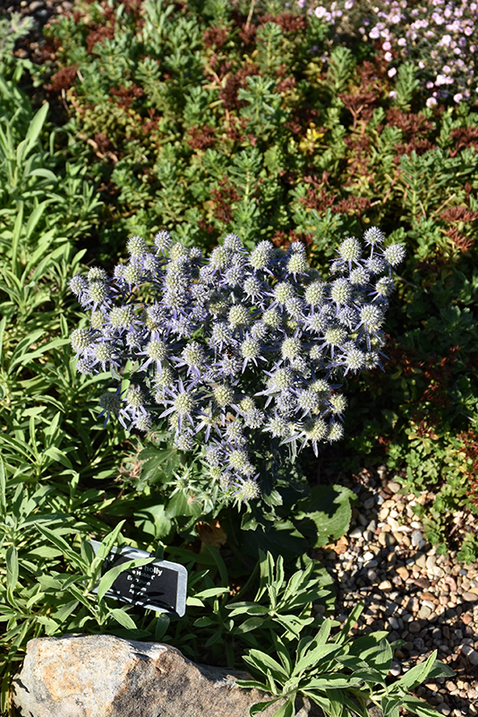 Blue Hobbit Sea Holly will grow to be about 12 inches tall at maturity extending to 18 inches tall with the flowers, with a spread of 12 inches. When grown in masses or used as a bedding plant, individual plants should be spaced approximately 10 inches apart. Its foliage tends to remain dense right to the ground, not requiring facer plants in front. It grows at a medium rate, and under ideal conditions can be expected to live for approximately 10 years. As an herbaceous perennial, this plant will usually die back to the crown each winter, and will regrow from the base each spring. Be careful not to disturb the crown in late winter when it may not be readily seen!