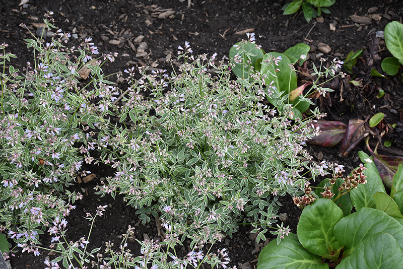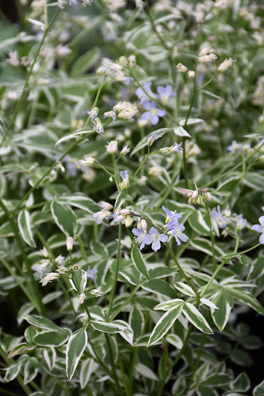 This distinctive variety forms a ferny mound of variegated green foliage that is edged in white, and is loosely topped with sky blue flowers in late spring; looks great in the middle to front of the border and easily mixes with other plants